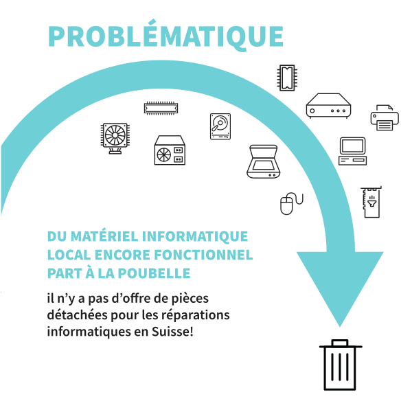 L’essentiel de l’empreinte écologique du matériel informatique (énergie grise, émissions de gaz à effet de serre, etc.) se situe dans la phase précédant l’achat par l’utilisateur. Il est donc important de rallonger le plus possible la durée d’exploi-tation de ce matériel et de contrer l’obsolescence programmée en freinant le réflexe de remplacement par du neuf. Mais à l’heure actuelle, il n’existe aucune offre de pièces dé-tachées en Suisse et les réparateurs doivent s’approvisionner sur le mar-ché international, ce qui renchérit les prix et implique des délais souvent rédhibitoires.